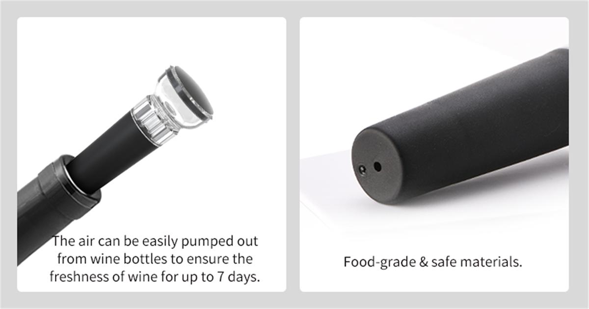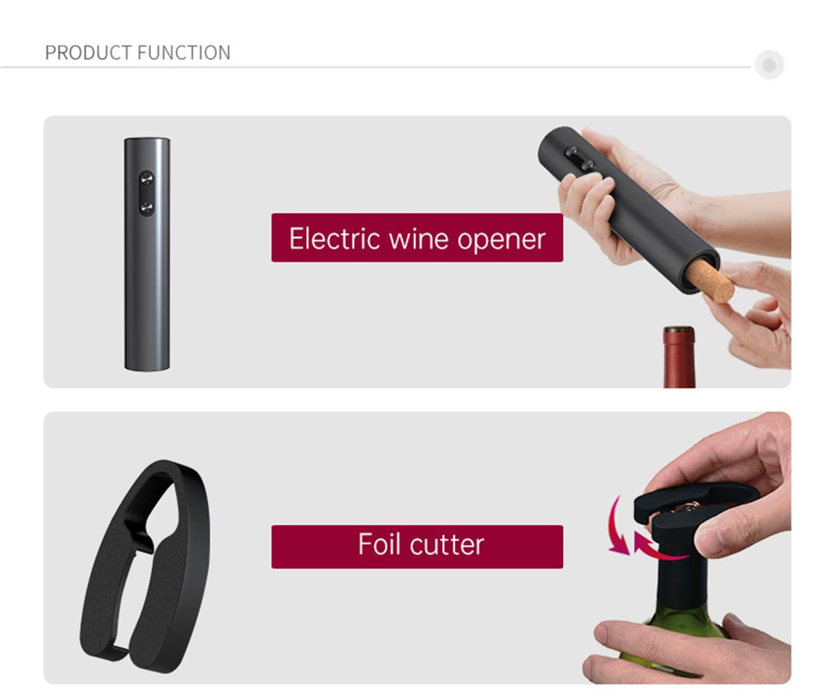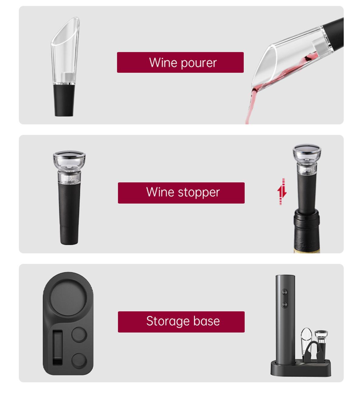 4. Combination: Battery Operated Wine Opener*1, Wine Pourer*1,Wine Stopper*1, Foil Cutter*1, Manual*1, Color Box*1