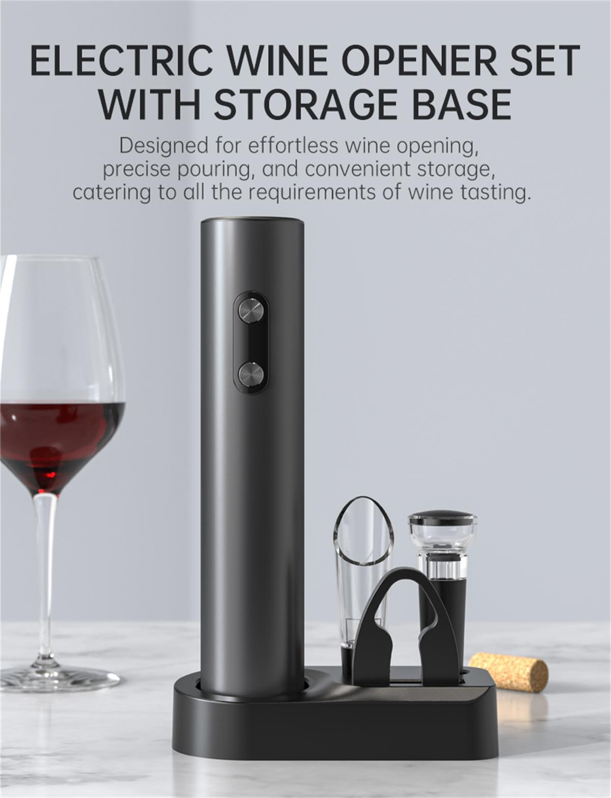 1. Exquisite 4 in 1 luxury battery operated wine opener gift set: LED logo display battery operated wine opener, wine pourer, vacuum pump and foil cutter.