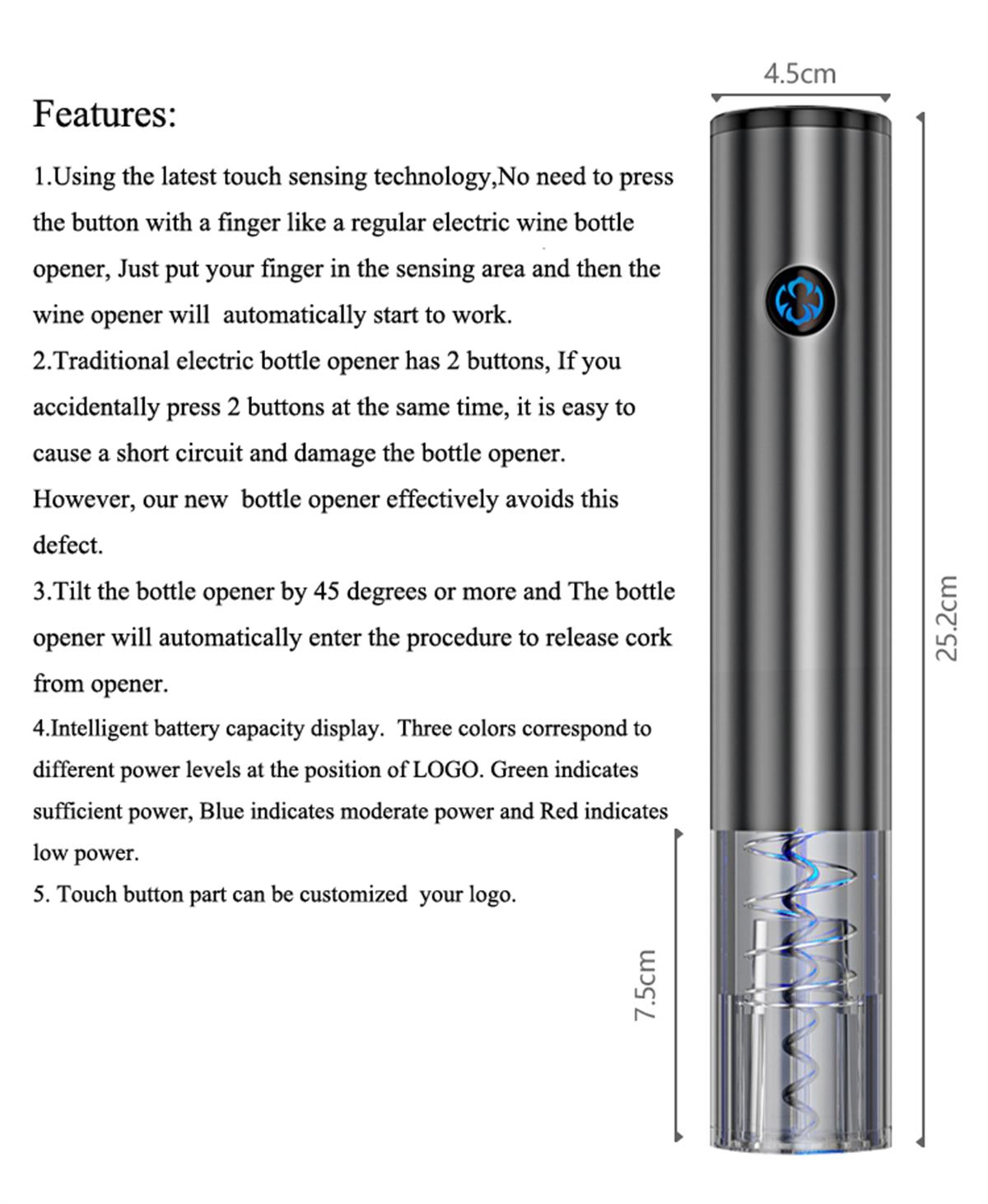 1. One Touch Inductive Switch,One touch control, 90°One Button Bottle Opening, 45°One Touch Button Separate Cork. Automatic cork removal function.