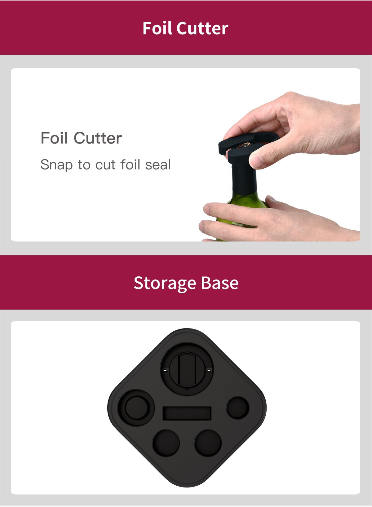 5. Combination: Rechargeable Electric Wine Opener*1, Foil Cutter*1, Wine Aerator & Pourer*1, vacuum pump with 2 Stoppers*1, Storage Display Base*1, Charging Cable*1, Manual*1, Color Box*1